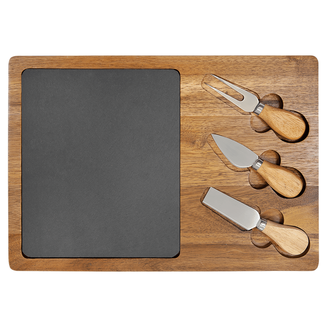 Acacia Wood/Slate Rectangle Cheese Set with Three Tools, 13 3/4" x 9 3/4"
