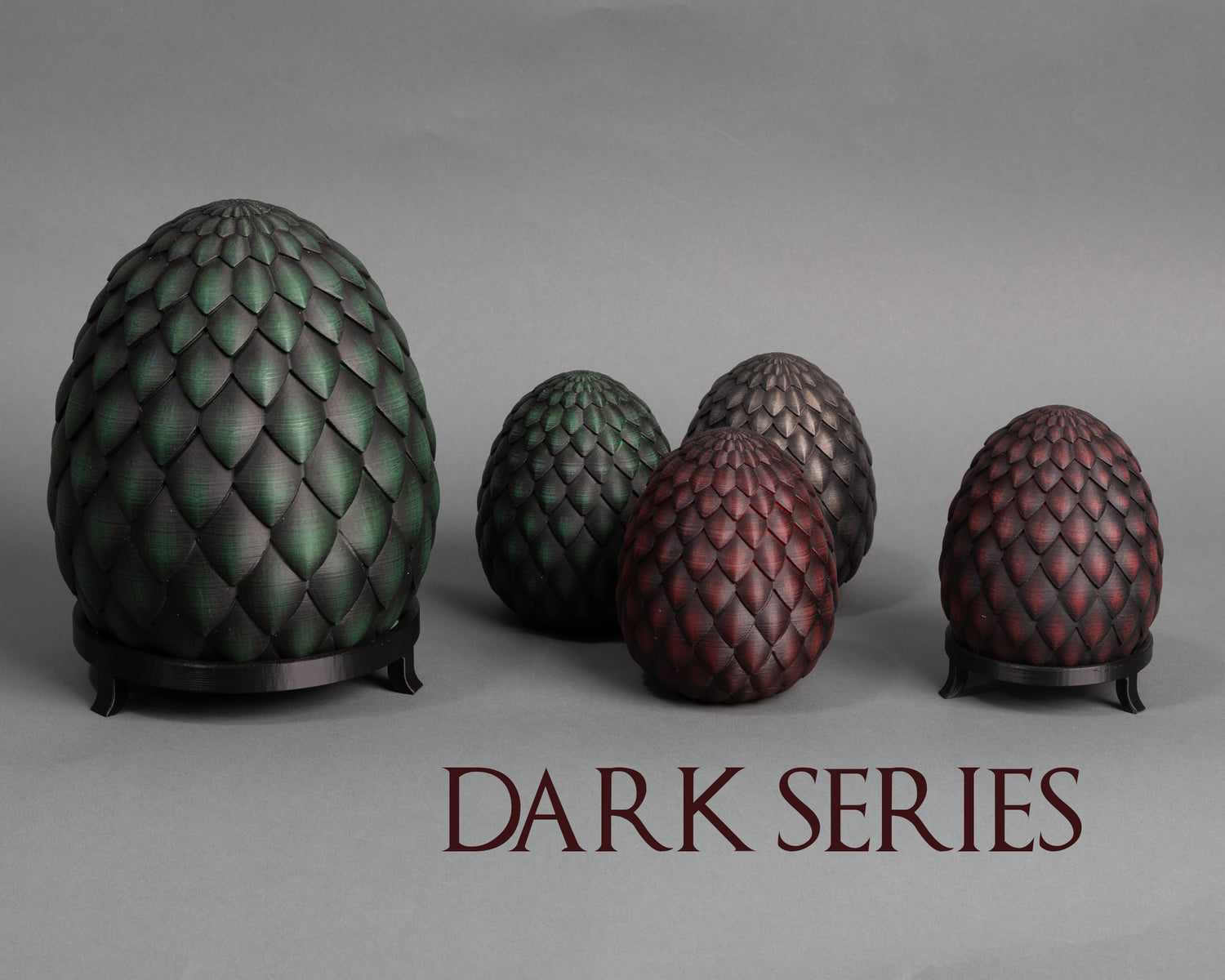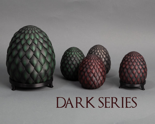 3D printed Dragon Egg. 3 sizes available. 4" tall and 8" tall, and the new Mini 2.5" size. Each come with a stand to display the egg. Great for display or for Cosplay.