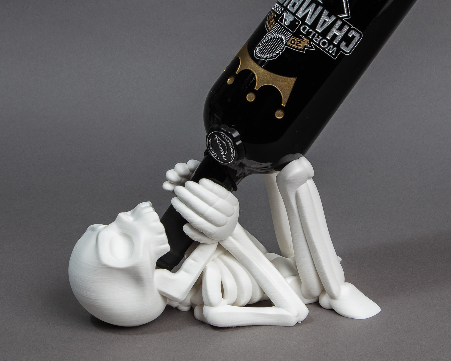 The Skeleton Wine Bottle Stand is 3D printed from white PLA plastic and looks great on a countertop for a Halloween party, or any time if that's your vibe. Holds a standard size wine bottle and not much else.